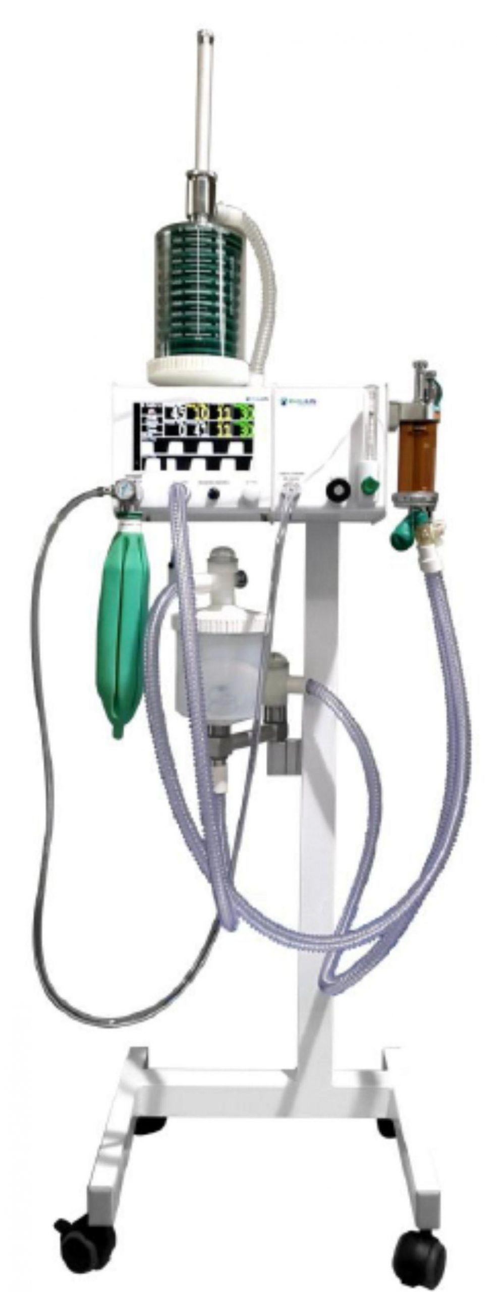 I – Ventilador Micro Processado Digital, ciclado a tempo e limitado a volume ou ciclado a pressão, composto de Display LCD Gráfico colorido de alta definição de 7″ polegadas para registro dos valores dos parâmetros ajustados e medidos, gráfico em tempo real da pressão endo traqueal, manômetro digital para registro da pressão endo traqueal do tipo Bar Graf, inclusive durante a ventilação manual além das informações de pressão de pico e informações de texto para a indicação de alarmes e modos de ventilação. A programação e ajustes são realizados por botão do tipo ’’ONE TOUCH’’, para os seguintes parâmetros: Frequência, Relação I/E, Tempo, Inspiratório, Volume, Alarme de Pressão Mínima e Alarme de Pressão Máxima. Possui ainda fole intercambiável de 1000ml e alimentação por oxigênio.